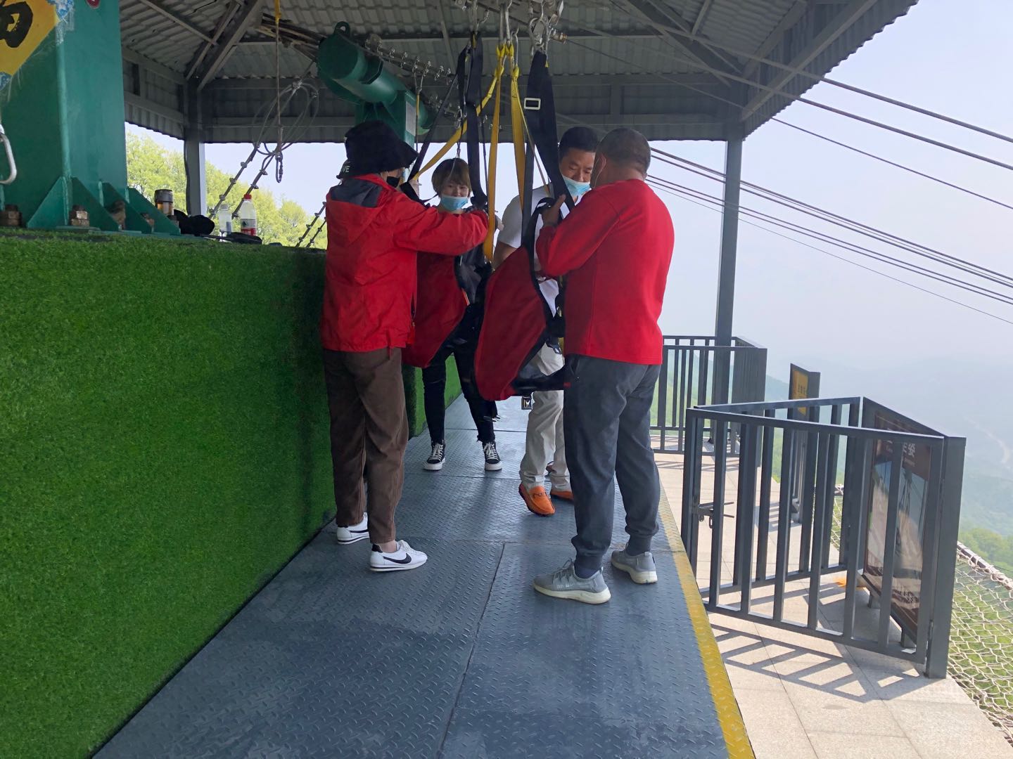 一是疫情防控不松懈,合理儲備防疫物資,每天對員工進行體溫檢測,車輛使用前后進行消毒,并根據當天人流量多次對滑索項目經營范圍內游客等候區(qū)、站房、設備等進行衛(wèi)生清潔和消毒,建立防疫相關臺賬,做到有據可查、有跡可循;在滑索入口,通過提示牌的方式引導游客自覺佩戴口罩,在游客排隊等候區(qū)域標畫出1.5米間距的警示線,引導游客保持距離,遵守公共秩序,積極配合防控工作。