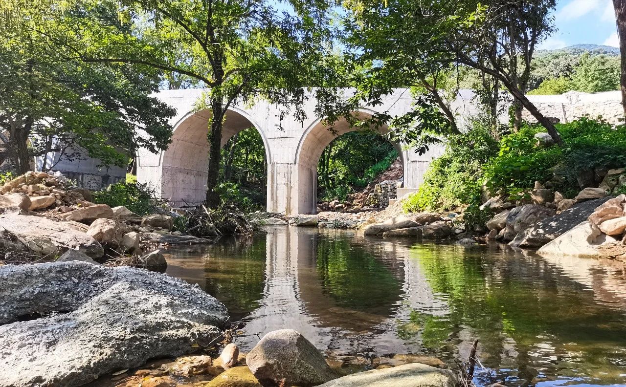 新建的橋梁宛如兩道彩虹橫跨孔雀溝景區(qū),登橋遠(yuǎn)眺,孔雀溝美景盡收眼底,茂密的樹木和巨大的橋洞映襯在清澈的湖水中,描繪出了大花果山景區(qū)全新的畫卷。